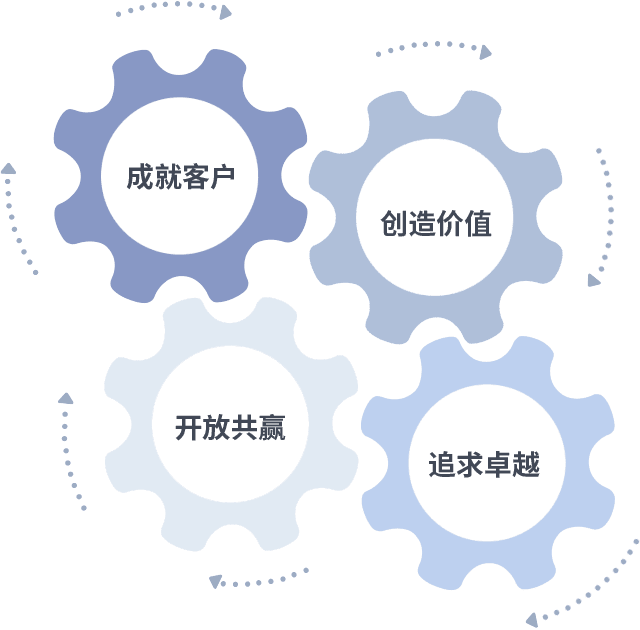 成就客户是一切决策的出发点,,创造价值是衡量所有工作的标准,,,,追求卓越是我们做事做人的态度,,,开放共赢是我们的格局也是最终的结果。。价值观的齿轮环环相扣,,推动着组织里的每个人不断向前。。。。