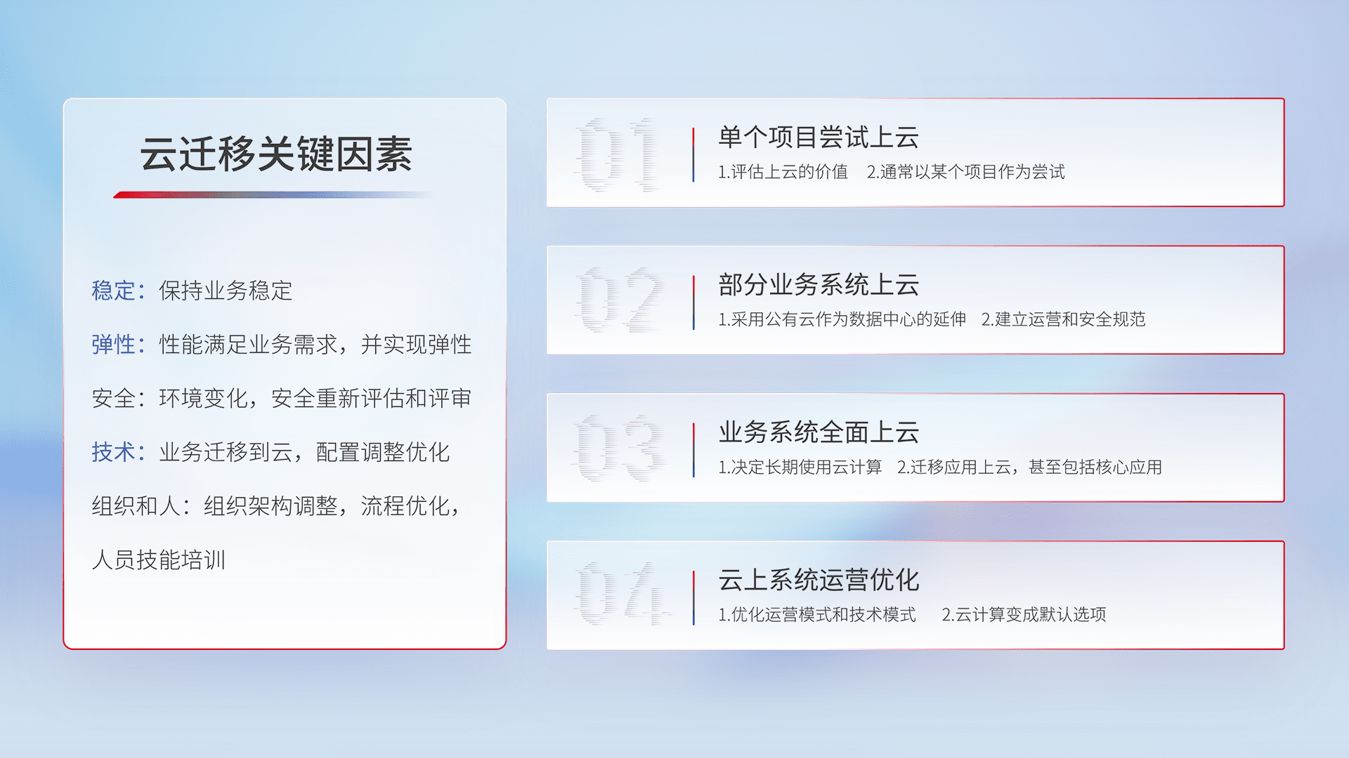 结合实际业务,,从规划设计、、云平台选型、、、云原生改造、、数据迁移、、、、集成交付,,迁移全过程为客户识别最佳上云路径,,,,做好风险识别管理,,,,设计网络架构、、身份权限、、安全审计合规、、操作审计、、、日志审计、、、、监控告警策略、、、、多站点容灾设计等,,对云上基础设施进行整体规划,,,,提升IT治理水平,,以满足弹性、、、、高可用、、高性能的需求。。。